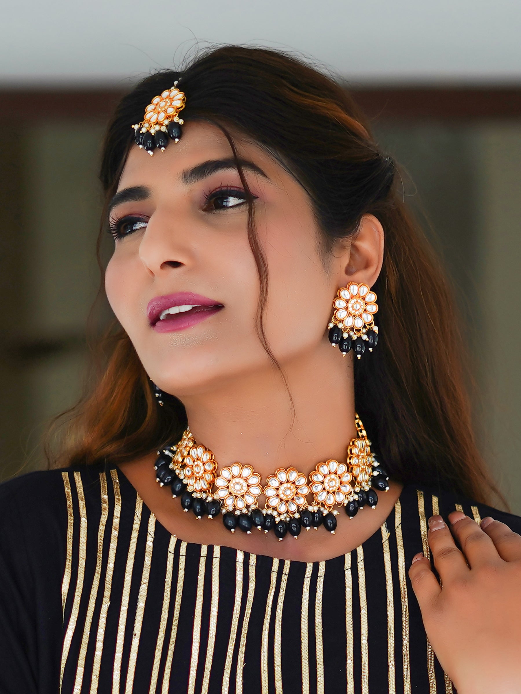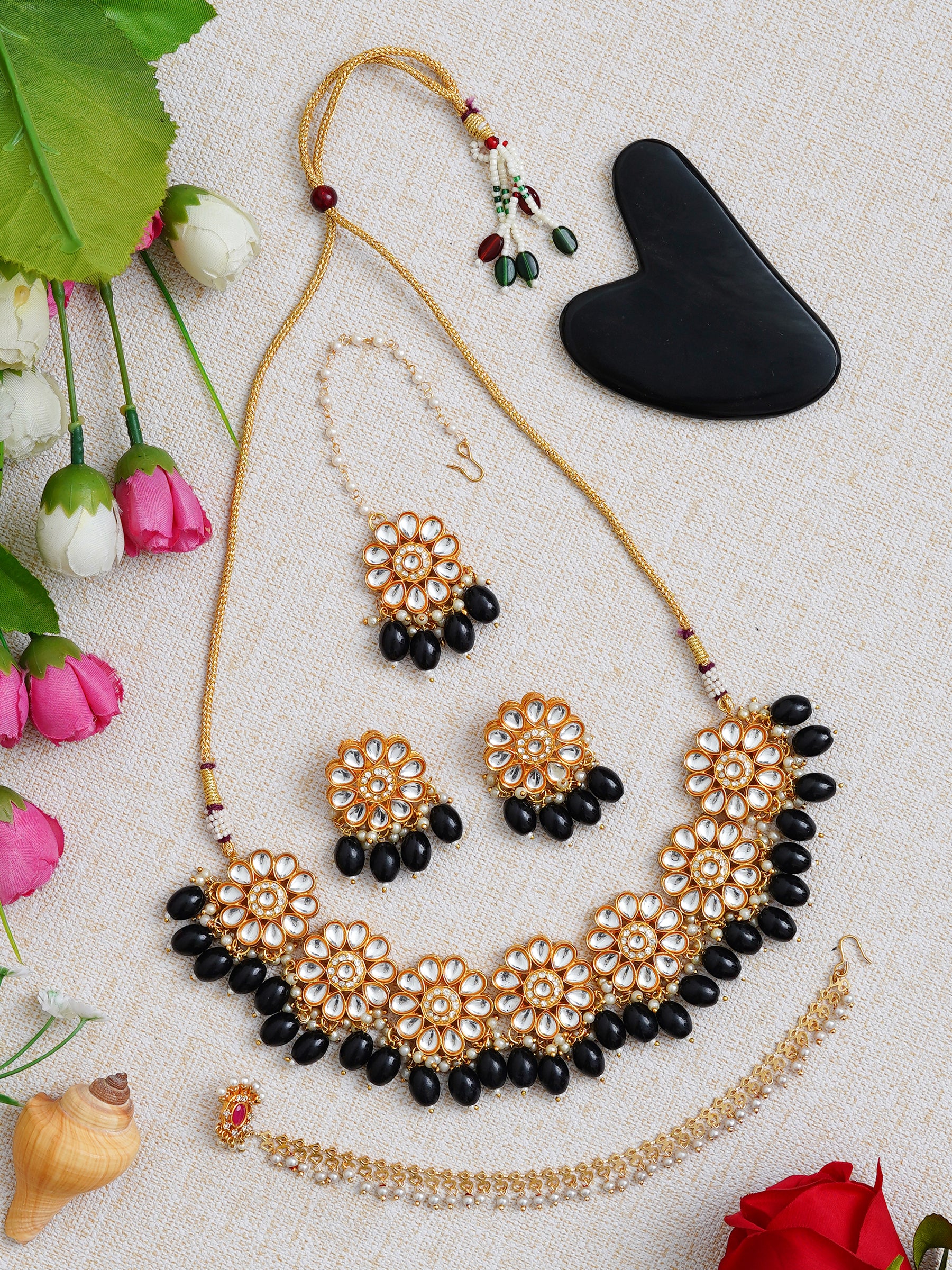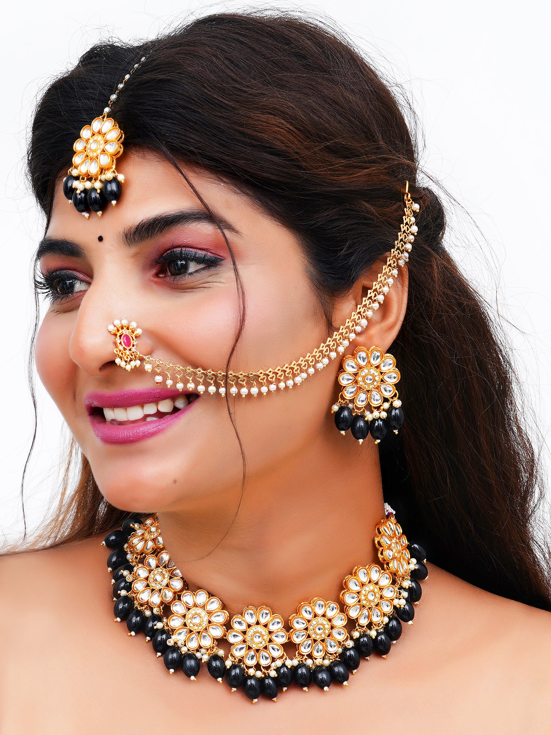 Gold Plated Kundan Stone Studded & Beaded Jewellery Set