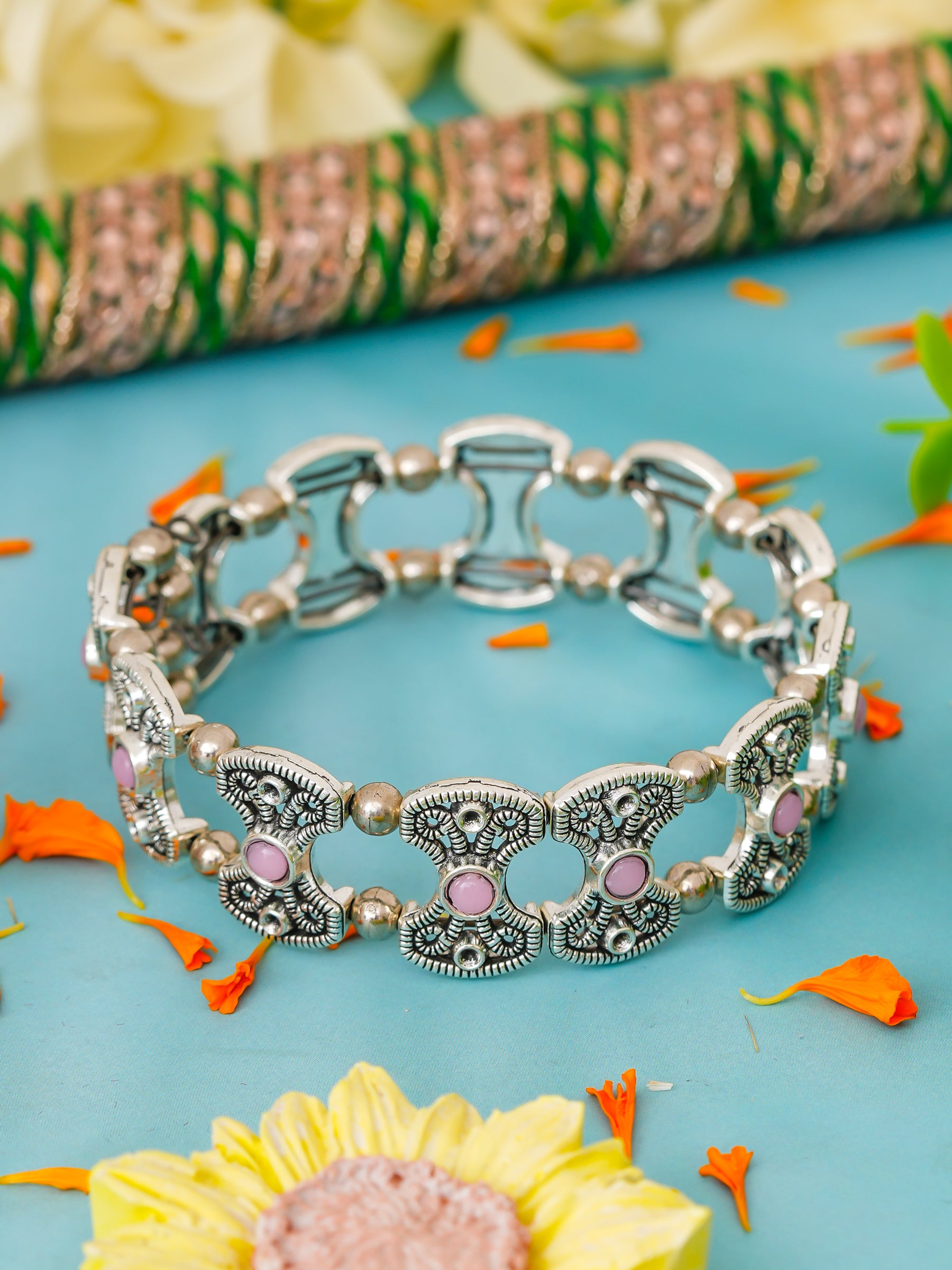 Add a touch of elegance to your ethnic jewelry collection with this Silver Floral Kada. Crafted with a polished silver finish, the bangle features intricate floral designs, giving it a timeless and sophisticated appeal. Perfect for pairing with traditional outfits or fusion wear, this kada enhances your style for festive occasions, weddings, and special events.